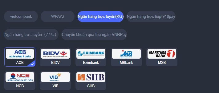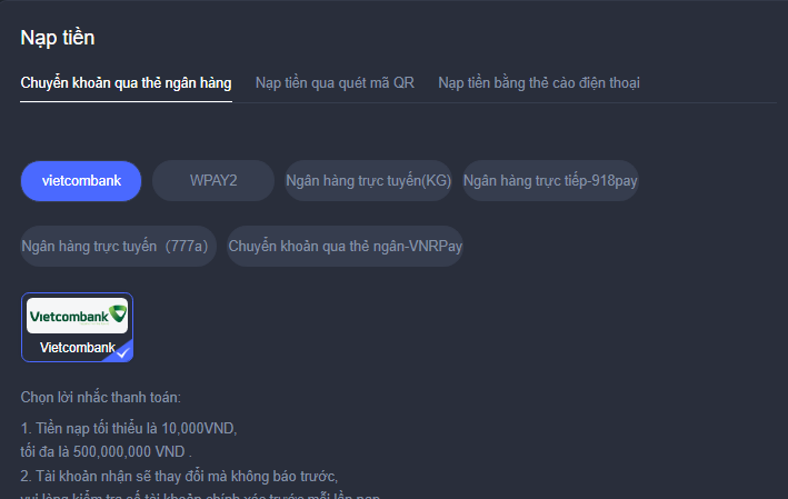 - Nạp tiền qua ngân hàng: Hỗ trợ nhiều ngân hàng lớn tại Việt Nam như Vietcombank, Techcombank, ACB, BIDV,…